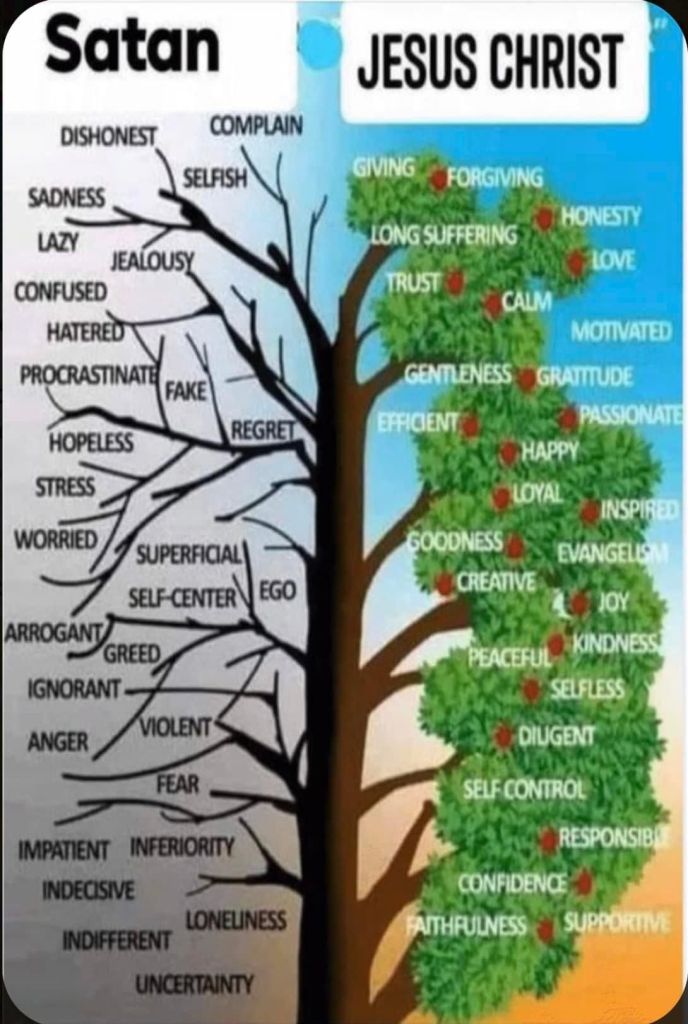 The image is misleading again in its statement of “confidence” due to the dry branches’ side naming sin and putting the responsibility of emotional states under the banner of Satan. The fruitful side would then imply that we should have confidence like Jesus did, but that is not what the scriptures say. The scriptures say, our confidence comes from the Lord Jesus Christ, not of ourselves. Since the image is represented as duality, that would then suggest that our sins come from Satan, but they don’t. Our sins come from the fall of Adam and Eve. Satan presented the temptation to sin.